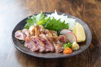 霧島山麓の澄んだ水で育った宮崎赤鶏は、クセが無く適度な弾力。噛むほどに増していく鶏の旨みを堪能できます。 新鮮な宮崎赤鶏の表面を炭火で炙り、あっさりとした上品な味わいです。