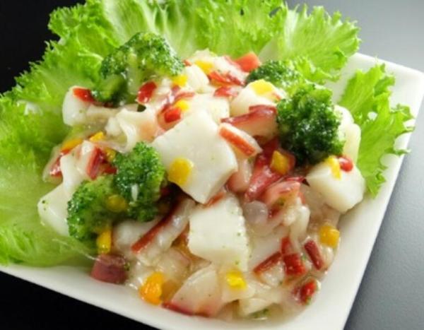 柔らかくボイルしたイカに、カニ風味蒲鉾と野菜を和えて、 オリーブオイルの風 味をプラスしたオリジナルドレッシングで仕上げました。 お好みで、野菜や魚介 類などの、旬の素材をトッピングしていただきますと、 より一層美味しくお楽し みいただけます。 日本で丁寧に加工され、冷凍保存で風味を保っています。