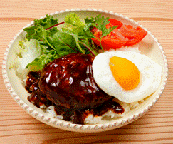 ハンバーグを二層構造にし、直火でじっくり焼く事で美味しさ、ジューシー感を閉じ込めました。 デミグラスソースは、たまねぎの甘味を活かした、ご飯に合う味付けに仕上げました。 ソースを内添する事で、煮込み感を出しています。