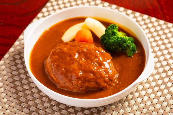 嶋田ハムの自家製デミグラスソースと地元大仙市産のトマトをあわせた特製ソースでハンバーグを煮込みました。ハンバーグは定番の牛肉と豚肉の合いびき肉を使用しています。