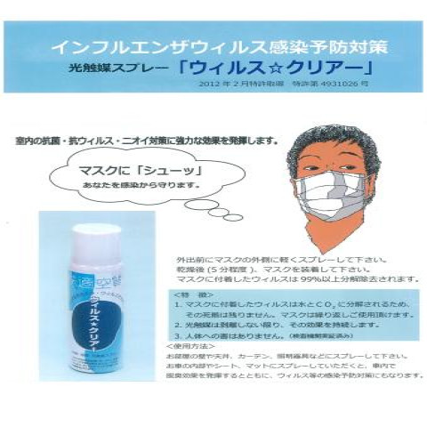 この酸化チタンに佐賀県が特許を持っているペルオキソチタン酸水溶液を加えて、誰でも手軽に使用できる100mlスプレーにしました。名称:光触媒スプレー「ウィルスクリアー(100ml)」「特許取得第4931026号」