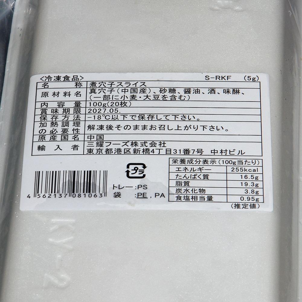 | 原材料、食品添加物 | 煮アナゴ(中国産)、砂糖、醤油、酒、味醂、(一部に小麦、大豆を含む) |