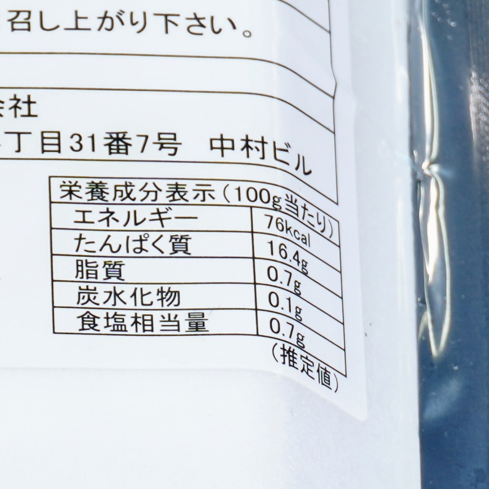 | 栄養成分表示 | 100gあたり 熱量 76Kcal たんぱく質 16.4g 脂質 0.7g 炭水化物 0.1g 食塩相当量 0.7g |