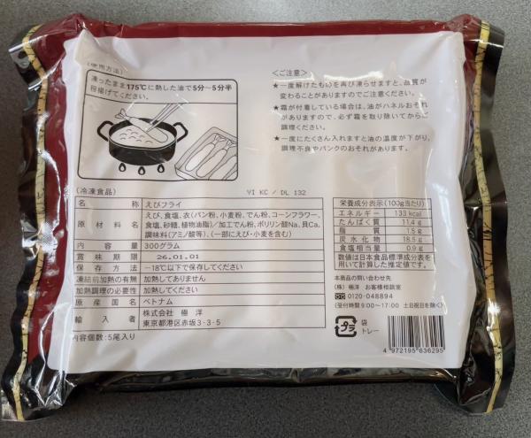 | 原材料、食品添加物 | エビ(養殖ブラックタイガー).食塩.衣(パン粉、小麦粉、でん粉、コーンフラワー、食塩、砂糖、植物油脂)/加工でん粉、ポリリン酸Na、貝Ca、調味料(アミノ酸) |