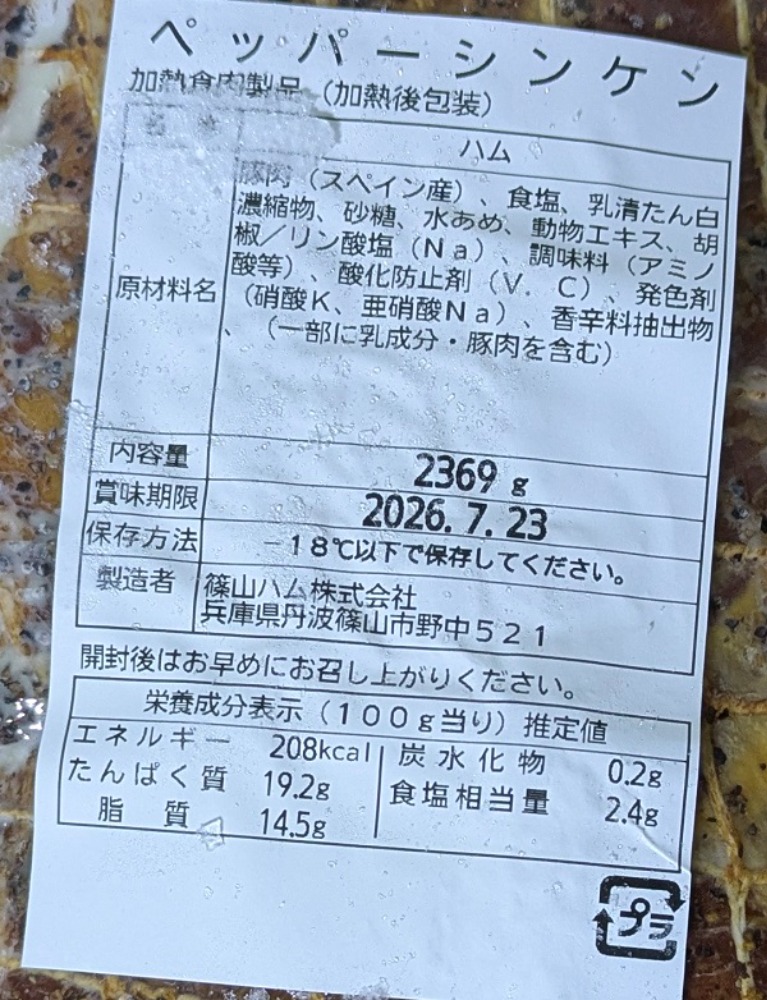 | 原材料、食品添加物 | 豚肉(オランダ産)、食塩、乳清たんぱく濃縮物、 砂糖、水あめ、香辛料、動物エキス /リン酸塩(Na)、調味料(アミノ酸等)、 酸化防止剤(V.C)、香辛料抽出物、 発色剤(硝酸K、亜硝酸Na) |