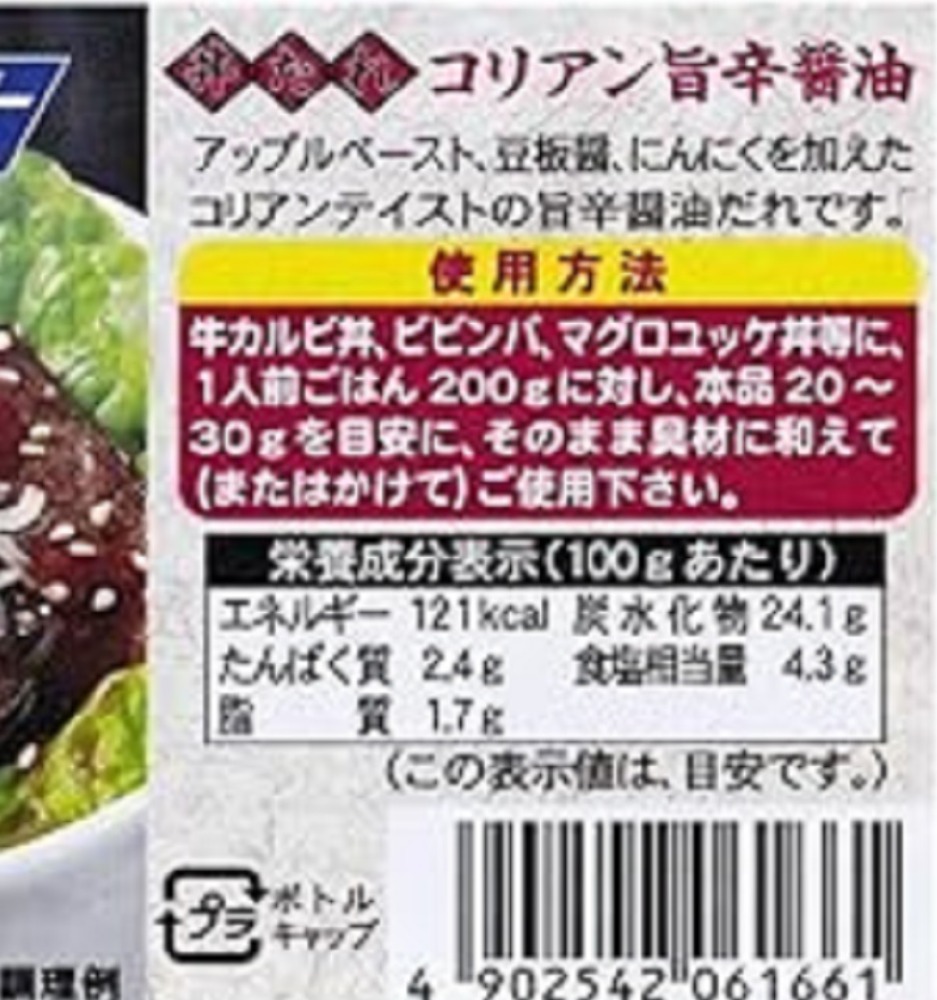 | 原材料、食品添加物 | 醤油(小麦・大豆を含む)(国内製造)、果糖ぶどう糖液糖、砂糖、豆板醤(小麦・大豆を含む)、にんにく、米発酵調味料、アップルペースト、オニオンペースト、シロップ、りんご濃縮果汁、胡麻油、唐辛子、生姜、香味食用油、酵母エキスパウダー/増粘剤(加工デンプン)、酒精、カラメル色素、pH調整剤、香料 |