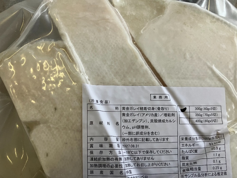 | 原材料、食品添加物 | 黄金ガレイ/増粘剤(加工デンピン)/貝殻カルシウム /Pℍ調整剤(一部に卵成分を含む) |