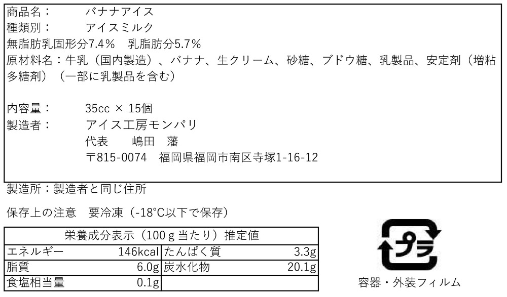 | 原材料、食品添加物 | 牛乳(国内製造)、バナナ(エクアドル・フィリピン)、生クリーム、砂糖、ブドウ糖、乳製品、安定剤(増粘多糖剤) | ||||||||||