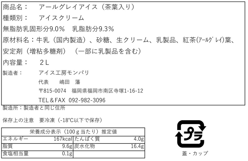 原材料、食品添加物 牛乳(国内製造)、砂糖、生クリーム、乳製品、紅茶(アールグレイ)葉、安定剤(増粘多糖剤)(一部に乳製品を含む)