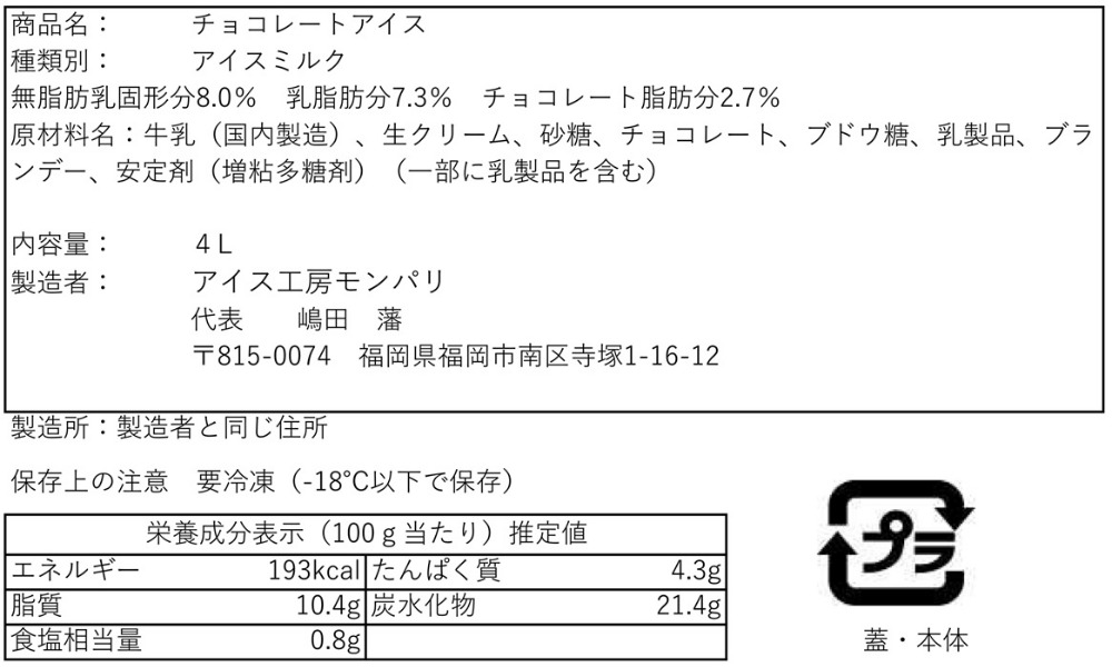原材料、食品添加物 牛乳(国内製造)、生クリーム、砂糖、チョコレート、ブドウ糖、乳製品、安定剤(増粘多糖剤)