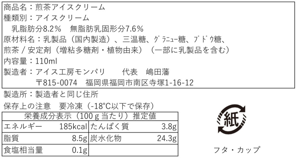 | 原材料、食品添加物 | 乳製品(国内製造)、三温糖、グラニュー糖、ブドウ糖、煎茶、安定剤(増粘多糖類) | ||||||||||