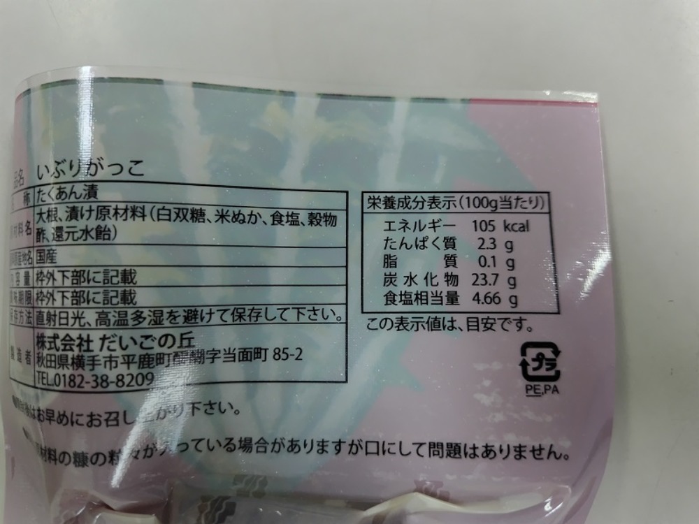 | 原材料、食品添加物 | 大根、漬け原材料(白双糖、米ぬか、食塩、穀物酢、還元水飴) |