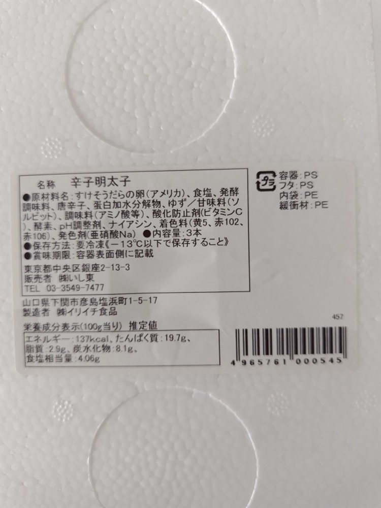 | 原材料、食品添加物 | すけそうだらの卵(アメリカ)、食塩、発酵調味料、唐辛子、蛋白加水分解物、ゆず/ 甘味料(ソルビット)調味料(アミノ酸等)、酸化防止剤(ビタミンC)、酵素、pH調整剤、ナイアシン、着色料(黄5、赤102)、発色剤(亜硝酸Na) |