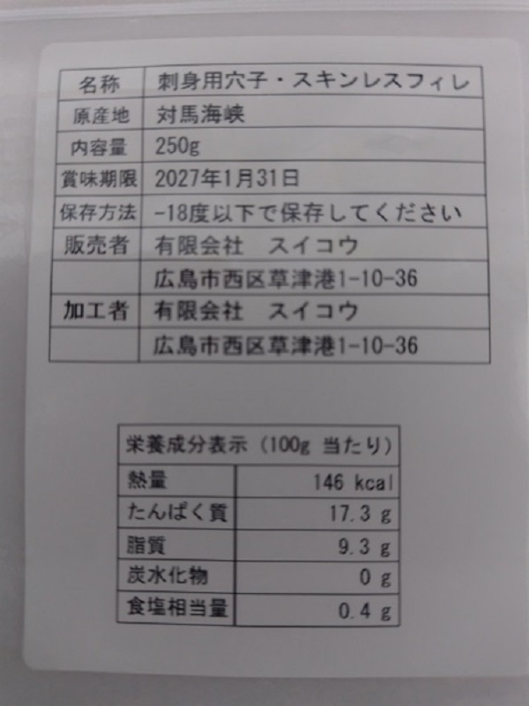 商品名 対馬海峡 刺身用 アナゴスキンレスフィレ