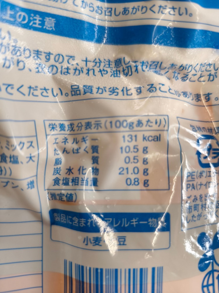 | 栄養成分表示 | 栄養成分表示(100gあたり) エネルギー131 kcal たんぱく質10.5 g 脂質0.5 g 炭水化物21.0 g 食塩相当量0.8 g 推定値 |