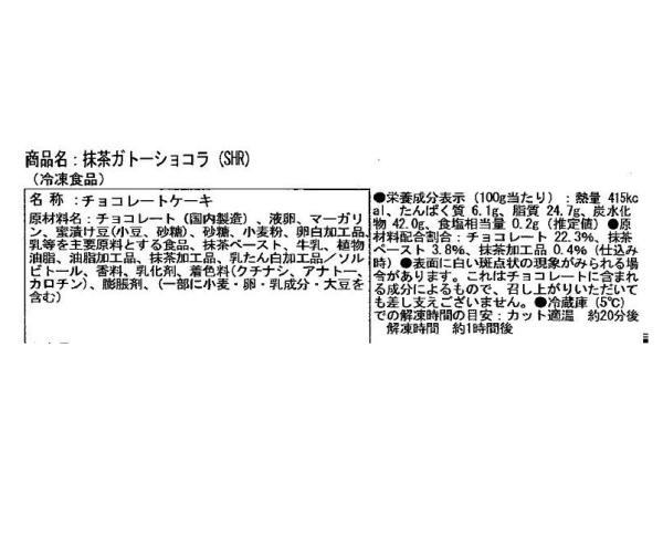 | 原材料、食品添加物 | 原材料名:チョコレート(国内製造)、液卵、マーガリン、蜜漬け豆(小豆、砂糖)、砂糖、小麦粉、卵白加工品乳等を主要原料とする食品、抹茶ペースト、牛乳、植物油脂、油脂加工品、抹茶加工品、乳たん白加工品/ソルビトール、香料、乳化剤、着色料(クチナシ、 カロチン)、膨脹剤、(一部に小麦・卵・乳成分・大豆を含む) |