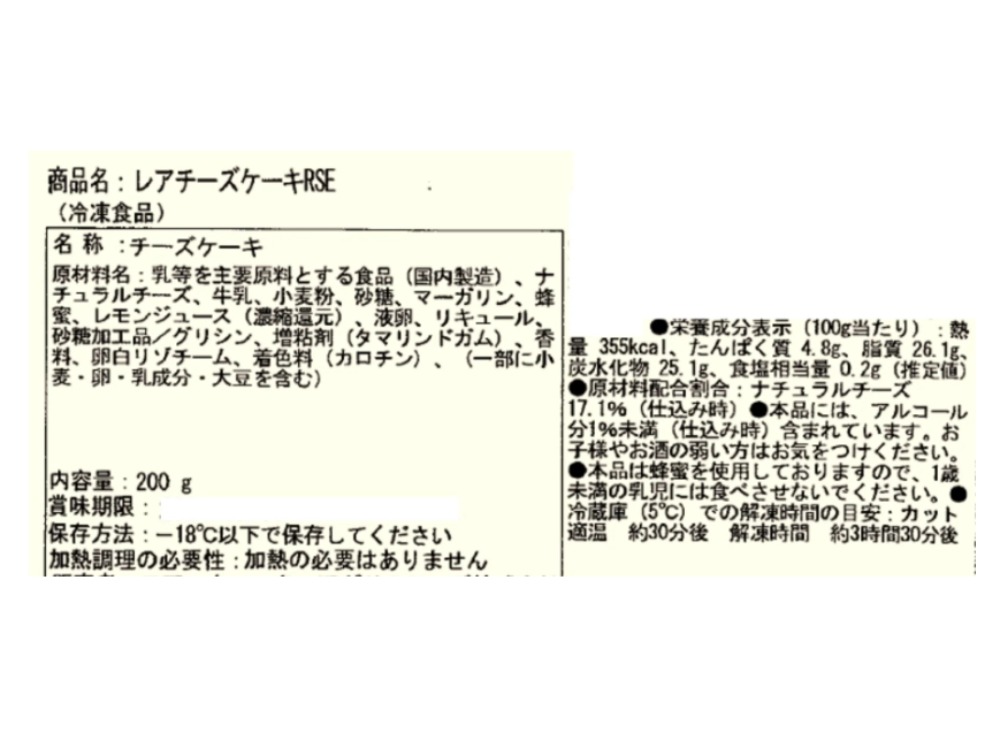 | 原材料、食品添加物 | 乳等を主要原料とする食品(国内製造)、ナチュラルチーズ、牛乳、小麦粉、砂糖、マーガリン、蜂蜜、レモンジュース(濃縮還元)、液卵、リキュール、 砂糖加工品/グリシン、増粘剤(タマリンドガム)、香料、卵白リゾチーム、着色料(カロチン)、(一部に小麦・卵・乳成分・大豆を含む) |