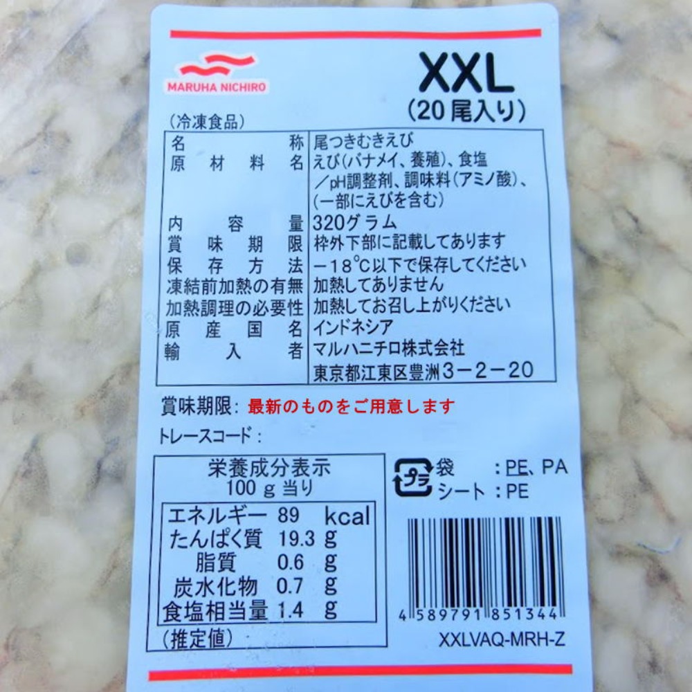 | 原材料、食品添加物 | えび(バナメイ、養殖)、食塩/pH調整剤、調味料(アミノ酸)、(一部にえびを含む) |