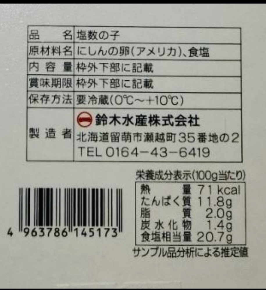 | 原材料、食品添加物 | ニシンの卵(アメリカ産)、食塩 |