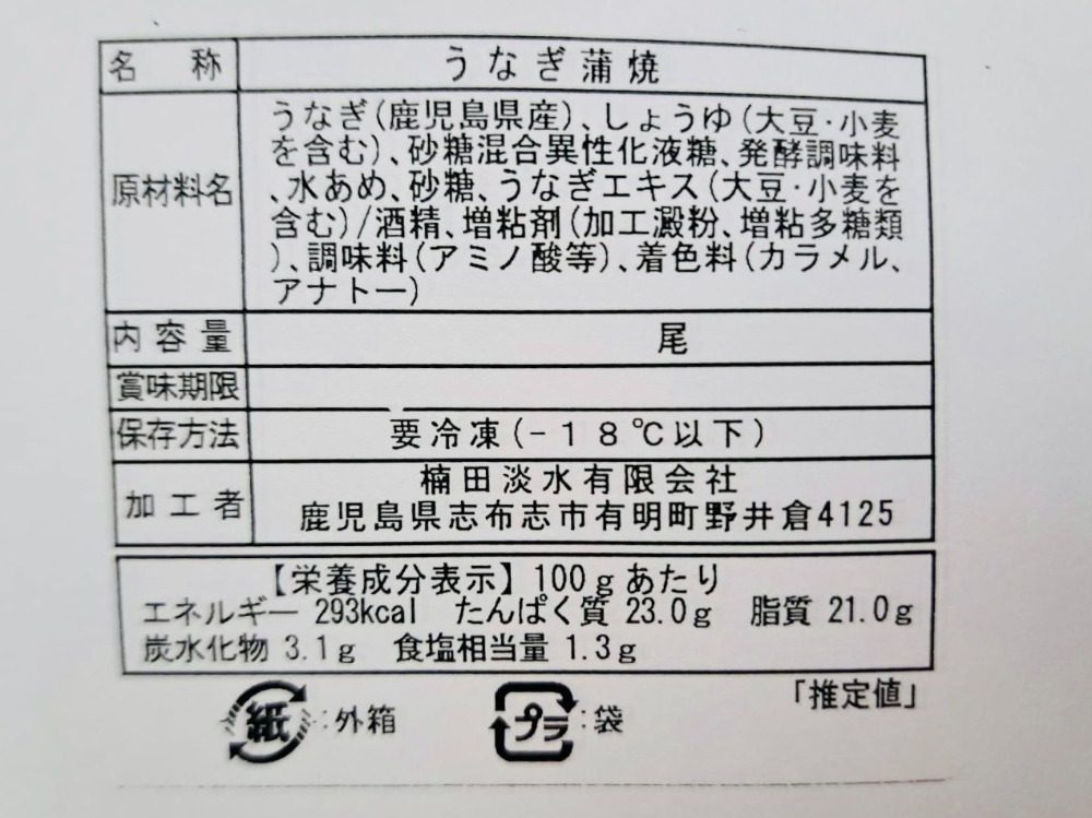 | 原材料、食品添加物 | うなぎ(鹿児島県産)、しょうゆ(大豆・小麦を含む)、砂糖混合異性化液糖、発酵調味料、水あめ、砂糖、うなぎエキス(大豆・小麦を含む)/酒精、増粘剤(加工澱粉、増粘多糖類)、調味料(アミノ酸等)、着色料(カラメル、アナトー) | ||||||||||