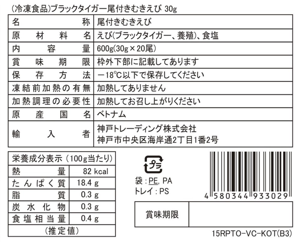商品名 ブラックタイガー尾付きむきえび 30gx20尾