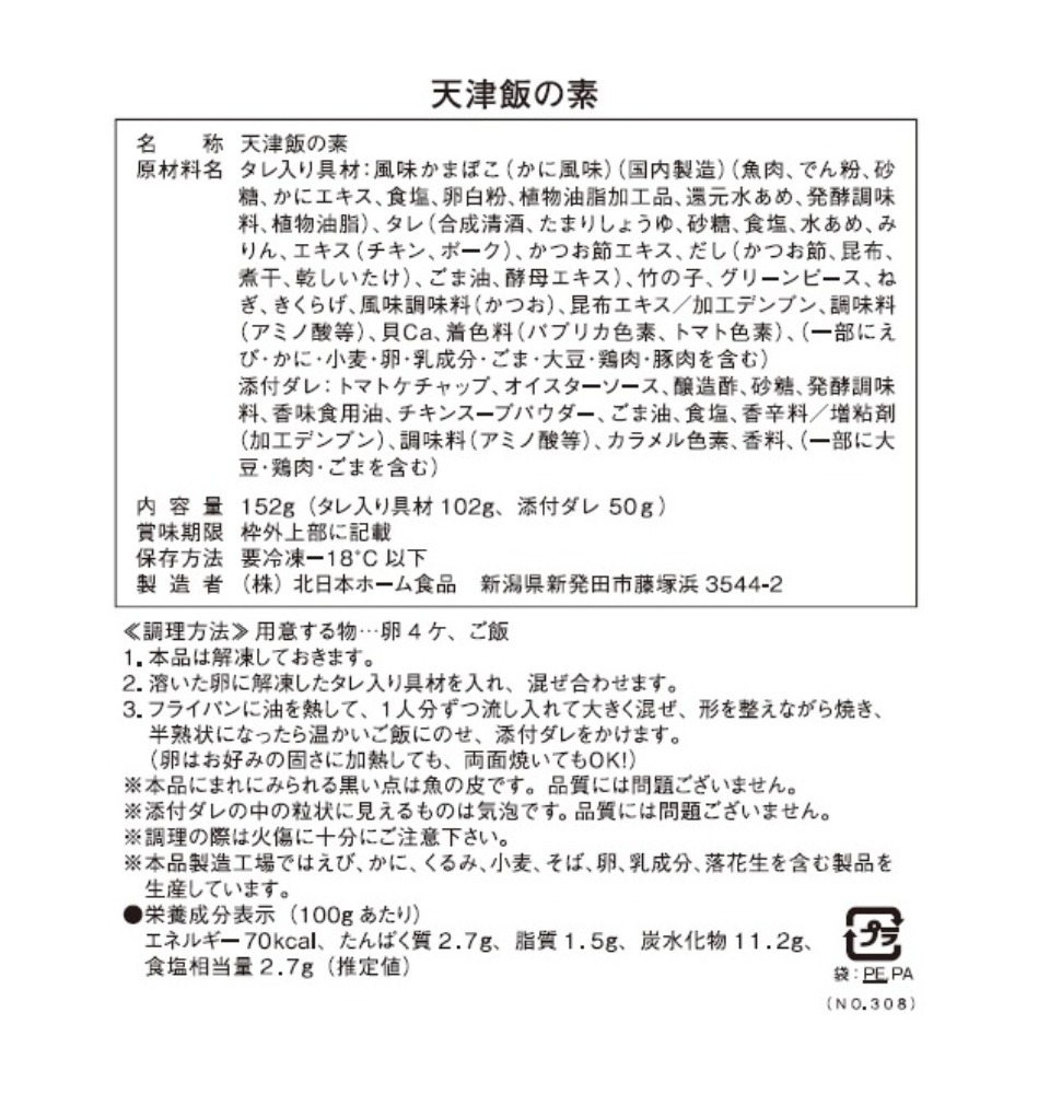 | 原材料、食品添加物 | タレ入り具材:風味かまぼこ(かに風味)(国内製造)(魚肉(たら、ほき、しろがねだら)、でん粉、砂糖、かにエキス、食塩、卵白粉、植物油脂加工品、発酵調味料、還元水あめ、植物油脂)、タレ(合成清酒、たまりしょうゆ、砂糖、食塩、水あめ、みりん、エキス(チキン、ポーク)、かつお節エキス、だし(かつお節、昆布、煮干、乾しいたけ)、ごま油、酵母エキス)、竹の子、グリーンピース、ねぎ、きくらげ、風味調味料(かつお)、昆布エキス/加工デンプン、調味料(アミノ酸等)、貝Ca、着色料(ベ紅麹、パプリカ色素)、(一部にえび・かに・小麦・卵・乳成分・ごま・大豆・鶏肉・豚肉を含む) 添付ダレ:トマトケチャップ、オイスターソース、醸造酢、砂糖、発酵調味料、香味食用油、チキンスープパウダー、ごま油、食塩、香辛料/増粘剤(加工デンプン)、調味料(アミノ酸等)、カラメル色素、香料、(一部に大豆・鶏肉・ごまを含む) |