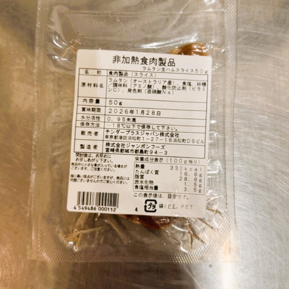 | 原材料、食品添加物 | ラムタン(オーストラリア産)、食塩、砂糖/調味料(アミノ酸等)、酸化防止剤(ビタミンC)、発色剤(亜硝酸Na) |