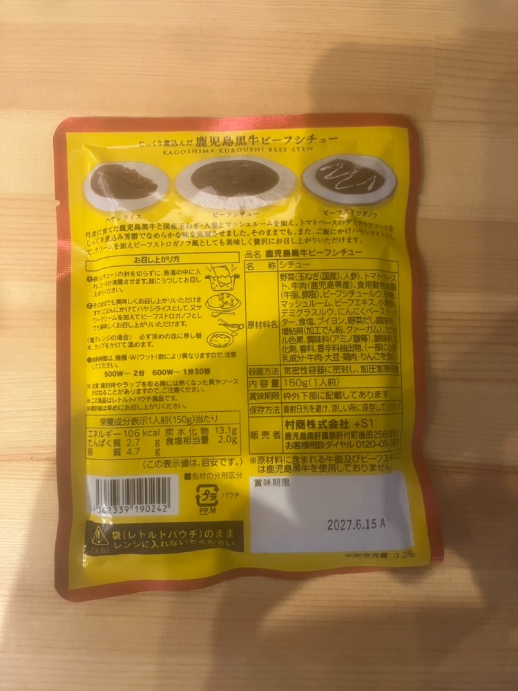 | 原材料、食品添加物 | 野菜(玉ねぎ(国産)、人参)、トマトペースト、牛肉(鹿児島県産)、食用動物油脂(牛脂、豚脂)、ビーフシチュールウ、砂糖、マッシュルーム、ビーフエキス、小麦粉、デミグラスルウ、にんにくペースト、バター、食塩、ブイヨン、野菜だし調味料/増粘剤(加工でん粉、グァーガム)、カラメル色素、調味料(アミノ酸等)、酸味料、乳化剤、香料、香辛料抽出物、(一部に小麦・乳成分・牛肉・大豆・鶏肉・りんごを含む) |