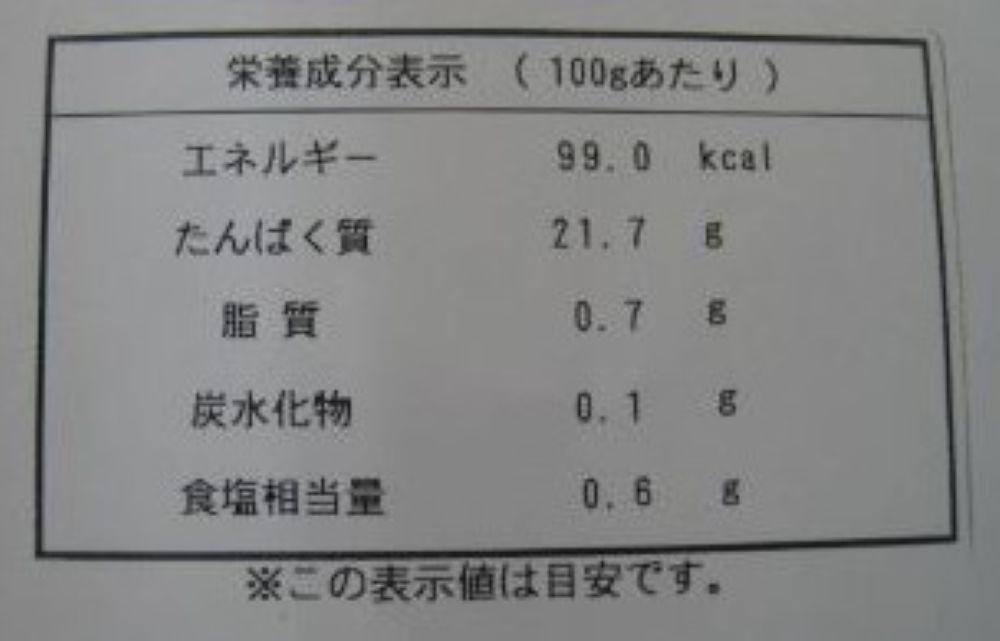 | 栄養成分表示 | 100gあたり エネルギー 99.0kcal たんぱく質 21.7g 脂質 5.1g 炭水化物 0.7g 食塩相当量 0.6g |