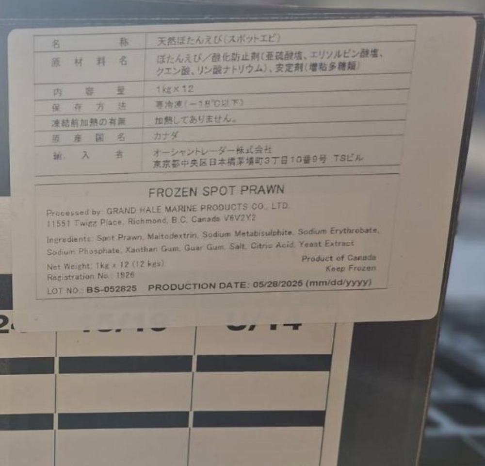 | 原材料、食品添加物 | ぼたんえび / 酸化防止剤(亜硫酸塩、エリンルビン酸塩、クエン酸、リン酸ナトリウム)、安定剤(増粘多糖類) |