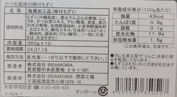 原材料、食品添加物 もずく(沖縄県産)、還元でんぷん分解物、しょうゆ、かつお節エキス、アミノ酸液、食塩、蛋白加水分解物、米発酵調味料、小麦発酵調味料、さばエキス、酵母エキス / 甘味料(ソルビット)、酸味料、調味料(アミノ酸等)、(一部に小麦・さば・大豆を含む)