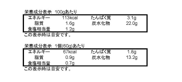 | 栄養成分表示 | 1個(60g)当たり エネルギー 67kcal たんぱく質 1.8g 脂質 0.9g 炭水化物 13.2g 食塩相当量 0.7g この表示値は目安です。 |
