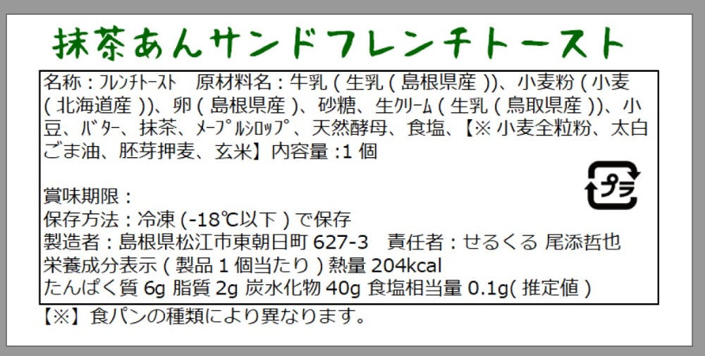 | 原材料、食品添加物 | 牛乳(生乳(島根県産))、小麦粉(小麦(北海道産))、卵(島根県産)、砂糖、生クリーム(生乳(鳥取県産))、小豆(北海道産)、バター(鳥取県産)、抹茶(島根県産)、メープルシロップ(カナダ産)、天然酵母、食塩【※小麦全粒粉、太白ごま油、胚芽押麦、玄米(食パンの種類により異なります。)】 | ||||||||||