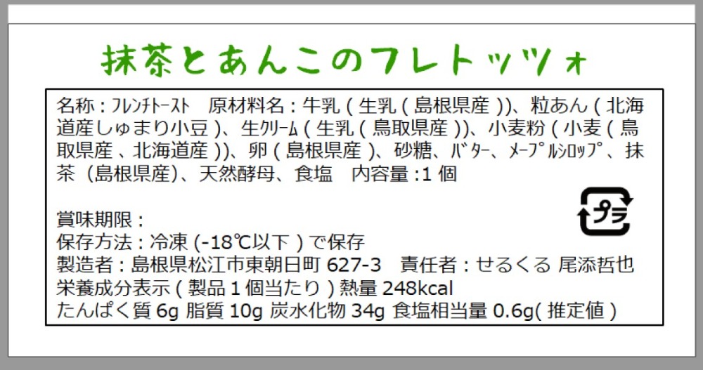 | 原材料、食品添加物 | 牛乳(生乳(島根県産))、小麦粉(小麦(北海道産))、卵(島根県産)、砂糖、生クリーム(生乳(鳥取県産))、小豆(北海道産)、バター(鳥取県産)、抹茶(島根県産)、メープルシロップ(カナダ産)、天然酵母、食塩 | ||||||||||