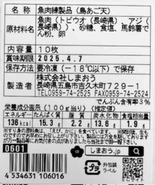 原材料、食品添加物 魚肉(トビウオ(長崎県)、アジ(長崎県))、砂糖、食塩、馬鈴薯でん粉、卵