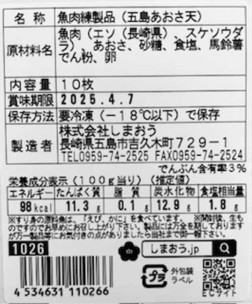 | 原材料、食品添加物 | 魚肉(エソ(長崎県)、スケソウダラ)、あおさ、砂糖、食塩、馬鈴薯でん粉、卵 | ||||||||||