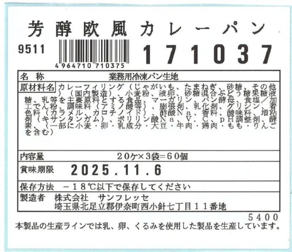原材料、食品添加物 カレーフィリング(じゃがいも、たまね ぎ、砂糖、その他)(国内製造)、小麦 粉、液卵、砂糖混合ぶどう糖果糖液 糖、乳等を主要原料とする食品、 マーガリン、パン酵母、食塩/加工 でん粉、調味料(アミノ酸等)、膨張 剤、乳化剤、グリシン、着色料(カラメ ル、カロチノイド)、酢酸Na、香料、酸 味料、増粘剤(キサンタンガム)、ポリ リン酸Na、V.C、pH調整剤、酵素、 (一部に小麦・卵・乳成分・大豆・牛 肉・鶏肉・もも・りんごを含む)