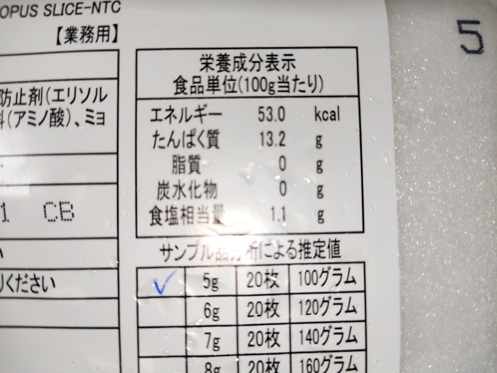 | 栄養成分表示 | (100g)当たり エネルギー 53.0kcal たんぱく質 13.2g 脂質 0g 炭水化物 0g 食塩相当量 1.1g |