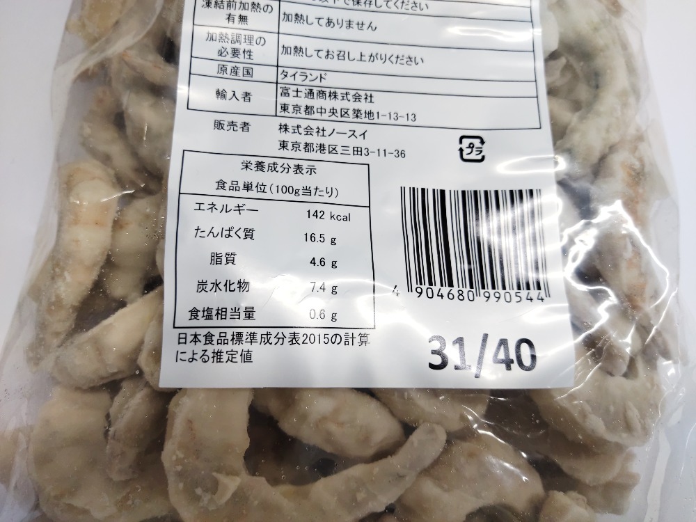 | 原材料、食品添加物 | バナメイ海老、馬鈴薯でんぷん、大豆油、卵白、食塩、砂糖、香辛料/調味料(アミノ酸)、pH調整剤(一部に卵・えび・大豆を含む) |