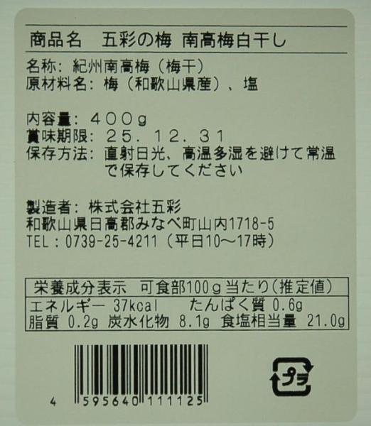 | 商品名 | 五彩の梅 南高梅白干し(梅干し・うめぼし) 400gx12