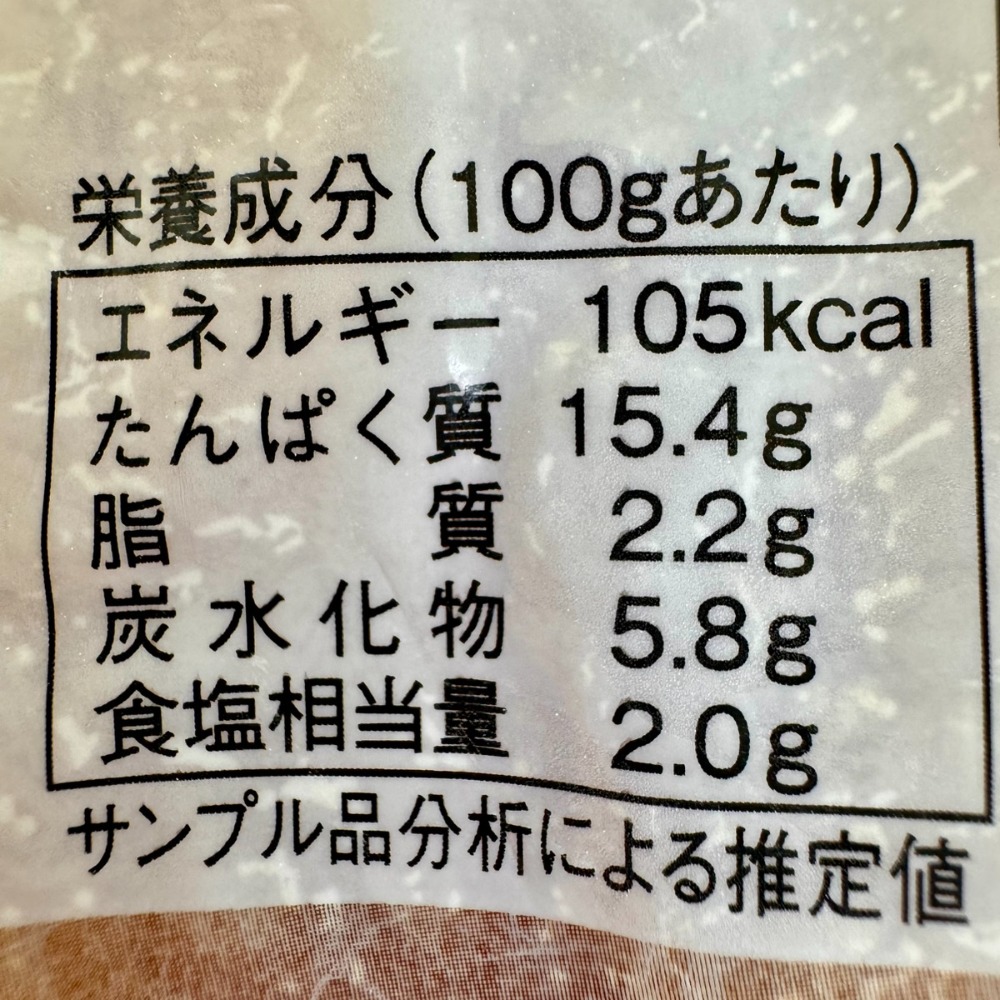| 栄養成分表示 | 栄養成分表示100gあたり 熱量kcal:105kcal タンパク質g:15.4g 脂質g:2.2g 炭水化物g:5.8g 食塩相当量g:2.0g (推定値) |