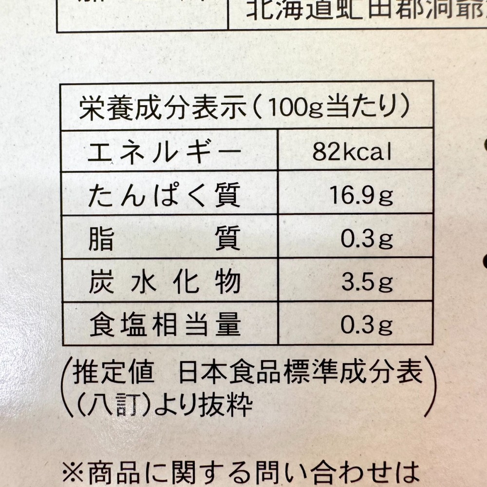 | 栄養成分表示 | 100gあたり 熱量 82kcal たんぱく質 16.9g 脂質 0.3g 炭水化物 3.5g 食塩相当量 0.4g (推定値) |