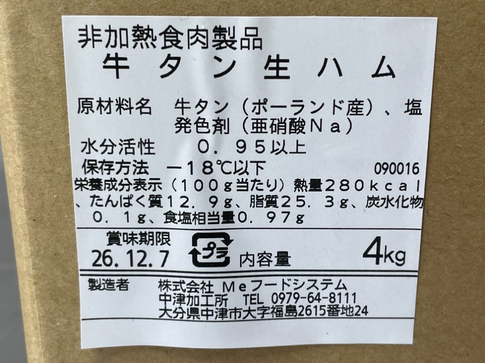 | 商品名 | 牛タン生ハム(ポーランド産)ブロックパック 4kg