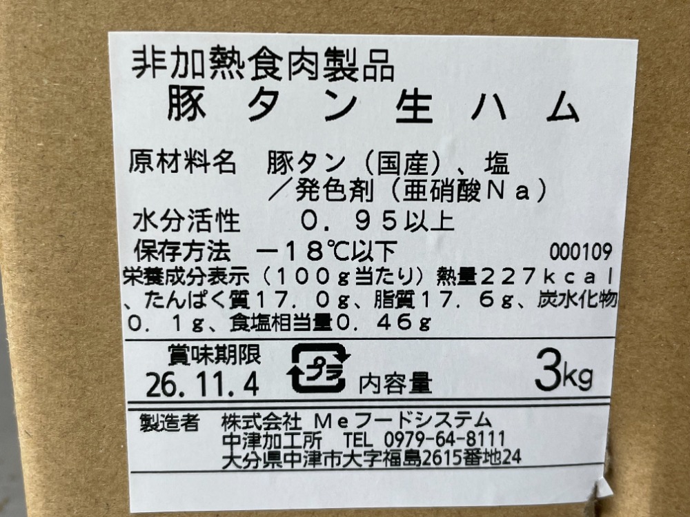 | 原材料、食品添加物 | 豚タン(国産)、食塩/発色剤(亜硝酸Na) |