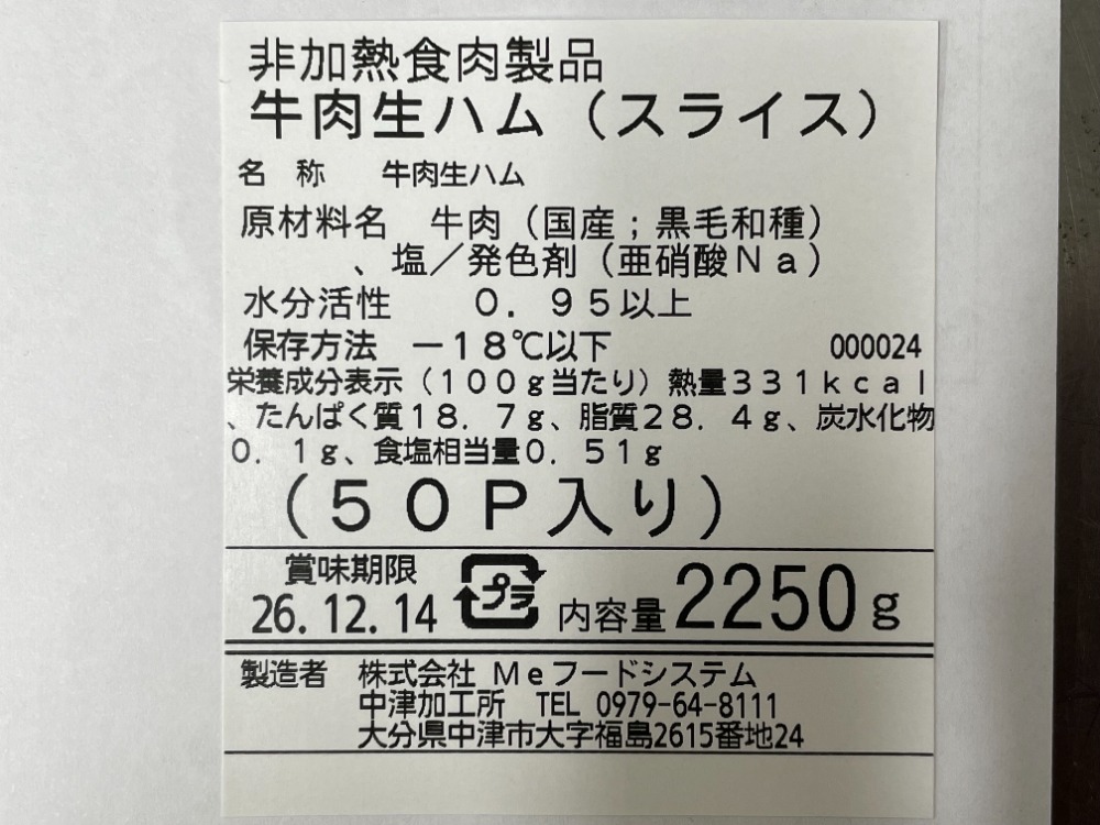 | 備考 | 非加熱食肉製品 牛肉生ハム 賞味期限は製造日から1年 |