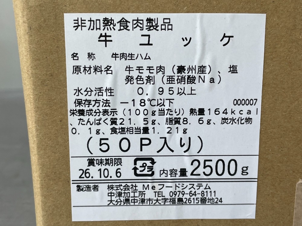 | 原材料、食品添加物 | 牛モモ肉(豪州産)、食塩/発色剤(亜硝酸Na) |