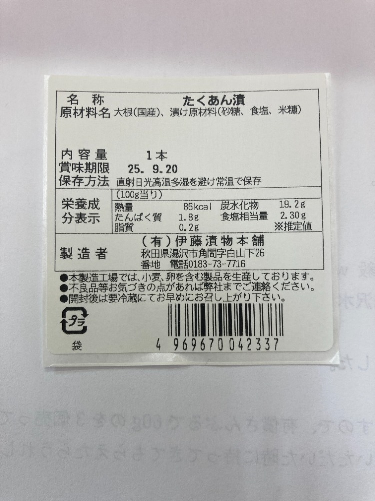 | 原材料、食品添加物 | 大根(国産)、漬け原材料(砂糖、食塩、米糠) | ||||||||||