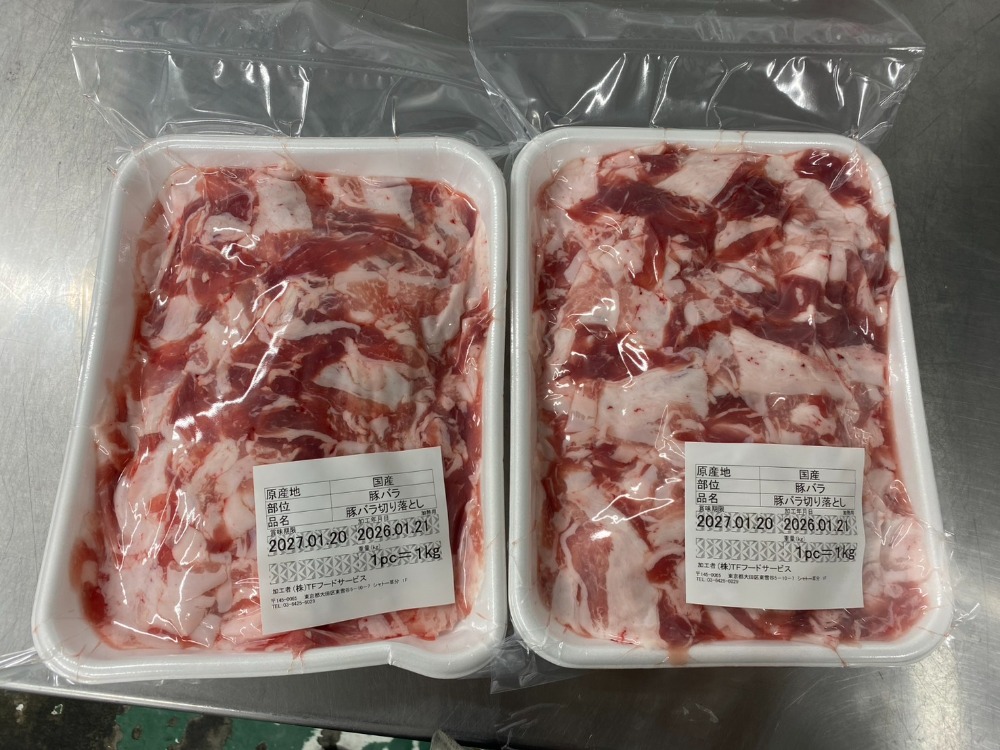 | 国産の豚バラ2mmスライスの切り落としです。1PC=1kg定貫商品です。ご不明点、ご要望、加工相談など、お気軽にご連絡くださいませ。ご注文の際、ご要望の重量での発送も可能です。『○○kg以内の送料で出荷』などご入力ください。 | |||||||